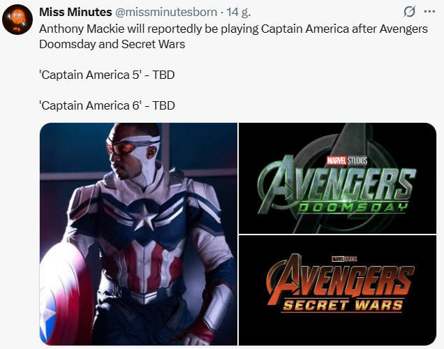 Nie jest to specjalnie nowa informacja, bo wiadomo, ze Anthony Mackie pozostanie Kapitanem Ameryką na długie lata w MCU, jednakże plotka ta potwierdza również, że Sama Wilsona czekają aż DWA solowe filmy po AVENGERS: SECRET WARS!