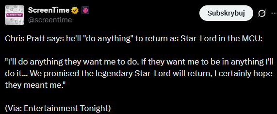 Chris Pratt wedle plotek powróci już w AVENGERS: DOOMSDAY a teraz sam aktor w rozmowie z ET potwierdził, że zrobi wszystko, czego będzie chciał od niego Marvel! Zatem możemy być spokojni. Legendarny Star-Lord powróci.