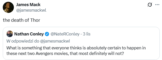 James Mack potwierdził, ze plotka o śmierci Thora w obu nadchodzących filmach AVENGERS to bzdura. Chris Hemsworth nie ma zamiaru odwieszać Mjolnira na wieszak w nadchodzących latach, a po wielkim finale sagi, jakim będzie AVENGERS: SECRET WARS zdecydowanie czeka nas film THOR 5.
