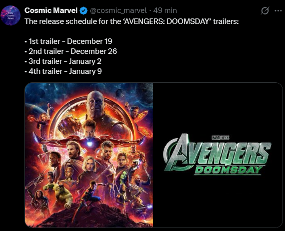 Marvel Studios wysyła do kin cztery różne zwiastuny filmu AVENGERS: DOOMSDAY! Każdy zwiastun będzie wyświetlany przez tydzień, po czym nastąpi przejście do następnego. Będą różniły się one od siebie pod względem „stylistycznym”. Pozostałe zmiany nie są na razie znane.