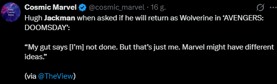 W związku z plotkami na temat jego roli w AVENGERS: DOOMSDAY (i kolejnym solowym filmie), Hugh Jackman nie przestaje spekulować na temat swojej przyszłości w roli Wolverine’a w Marvel Cinematic Universe po DEADPOOL and WOLVERINE.