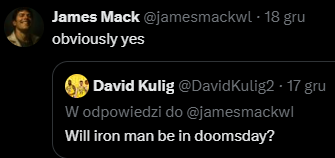Fani będą mieli przepiękny moment w AVENGERS: DOOMSDAY, w którym Robert Downey Jr. ponownie powróci jako Tony Stark / Iron-Man. Mówi się nawet, że bracia Russo szykują w filmie scenę walki Doctora Dooma z Iron-Manem!