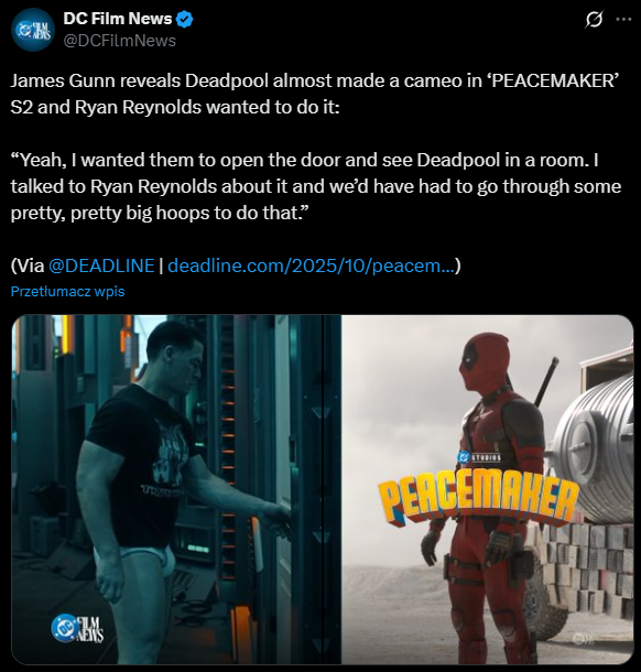 Tak, dobrze czytasz. James Gunn ujawnił, że Ryan Reynolds miał zagrać Deadpoola w finale 2. sezonu PEACEMAKER! Cameo nie pojawiło się w serii zapewne ze względu na prawa Marvela do postaci.