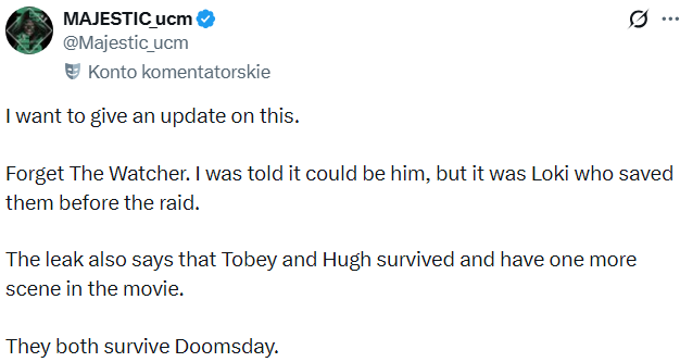 Według najnowszej plotki to Loki uratuje Spider-Mana i Wolverine’a przed zniszczeniem ich przez Inkursję. Najprawdpodobniej nie zobaczymy tego na ekranie, tylko dowiemy się o tym, gdy obaj bohaterowie powrócą zapewne pod koniec fabuły AVENGERS: DOOMSDAY. Obstawiam tutaj wielką, finałową bitwę.