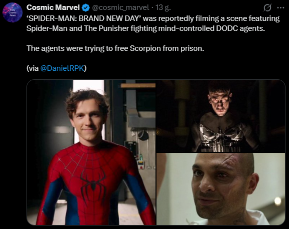 DanielRPK poinformował, że do filmu SPIDER-MAN: BRAND NEW DAY nakręcono niesamowitą scenę walki, w której Spider-Man i Punisher walczą z agentami DODC, którzy będąc pod kontrolą próbują uwolnić Scorpiona z więzienia!!!