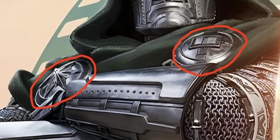 Podobnie jak w komiksach, na piersi Dooma znajdują się dwa zapięcia w kształcie dysku, które utrzymują jego pelerynę na szyi. Jednak w przeciwieństwie do swojego komiksowego odpowiednika, Doom Downeya ma dwa insygnia na każdym zapięciu. Przyglądając się im uważnie, ten po lewej stronie wydaje się przedstawiać logo Kapitan Marvel, a ten po prawej – coś, co wygląda jak zarys młota Thora, Mjolnira.