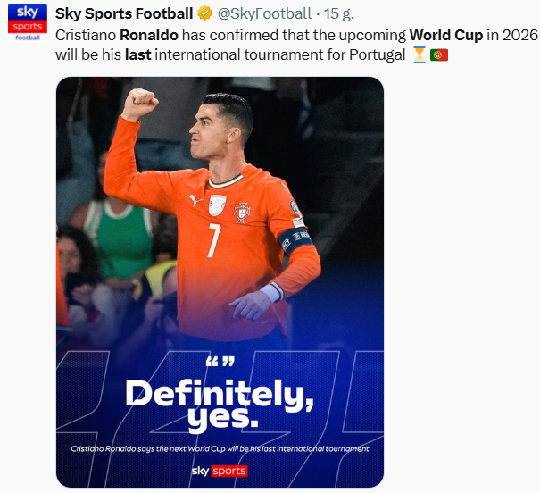 Cristiano Ronaldo oficjalnie potwierdził, ze Mistrzostwa Świata 2026 będą jego ostatnimi w karierze piłkarskiej, jednak nie potwierdził on czy to jego ostatni wielki turniej z kadrą Portugali.