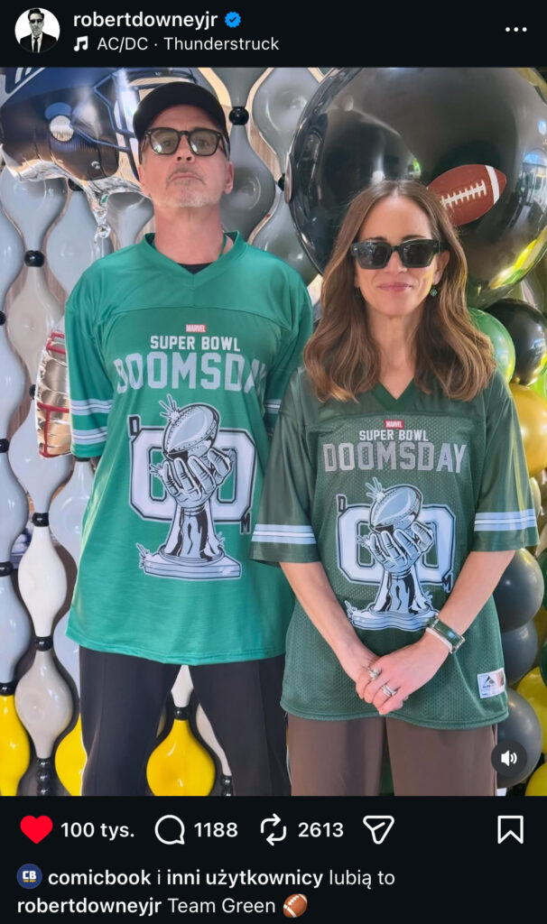 Robert Downey Jr. podczas trwającego właśnie Super Bowl dodał zdjęcie ze swoją żoną Susan, gdzie oboje noszą koszulki NFL z motywem filmu AVENGERS: DOOMSDAY! Czyżby miał jednak pojawić się trailer?!
