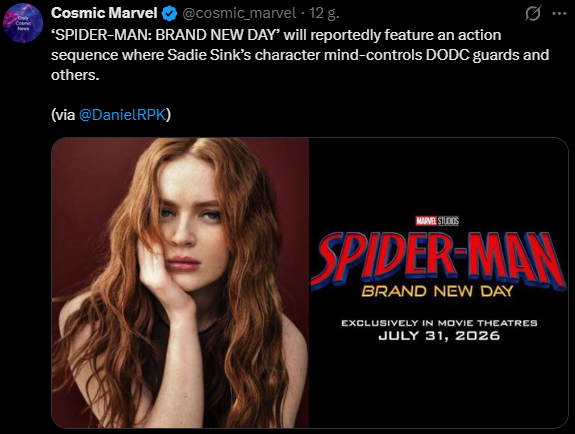 Cosmic Marvel donosi, że w filmie SPIDER-MAN: BRAND NEW DAY zobaczymy scenę z postacią graną przez Sadie Sink, w której ta kontroluje strażników DODC siłą umysłu! Brzmi znajomo, prawda? Jean Grey witamy w MCU!