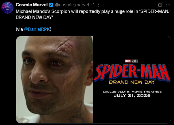 DanielRPK potwierdza, że Scorpion Michaela Mando będzie miał dużą rolę w fabule SPIDER-MAN: BRAND NEW DAY! Aktor oczywiście już nagrywa swoje sceny u boku Toma Hollanda.