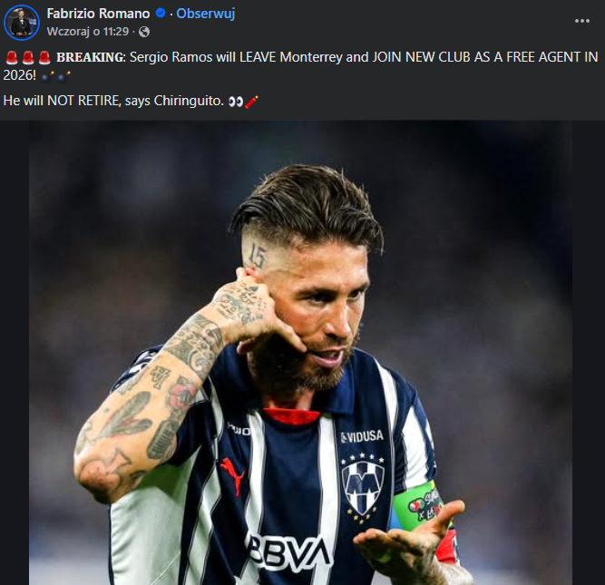Fabrizio Romano przekazał informację, że Sergio Ramos nie przedłuży umowy z Monterrey i jako wolny agent będzie szukał nowego klubu! Media podają, że jego celem jest powrót do Europy i pojechanie na MISTRZOSTWA ŚWIATA 2026!