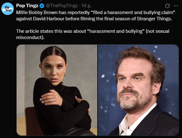 Jak podają doniesienia, Millie Bobby Brown „złożyła pozew o molestowanie i zastraszanie” przeciwko Davidowi Harbourowi przed rozpoczęciem zdjęć do ostatniego sezonu STRANGER THINGS. W artykule napisano, że chodziło o „nękanie i zastraszanie” (a nie o niewłaściwe zachowanie seksualne).