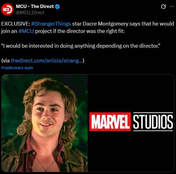 Dacre Montgomery, ujawnił, że byłby skłonny dołączyć do MCU, pod warunkiem spełnienia jednego warunku. Montgomery jest najbardziej znany szerokiej publiczności z roli Billy’ego Hargrove’a w popularnym serialu STRANGER THINGS.