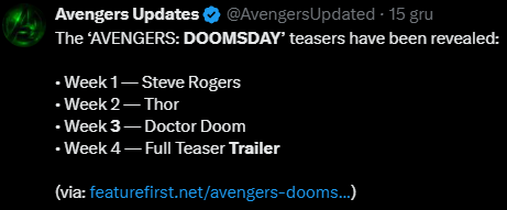 Wszelkie informacje się sprawdziły, więc tą informacje też moge Wam przekazać. Doctor Doom będzie bohaterem 4 teasera AVENGERS: DOOMSDAY i będzie to nasz pierwszy wgląd na zbroję Dooma w pełnej okazałości.