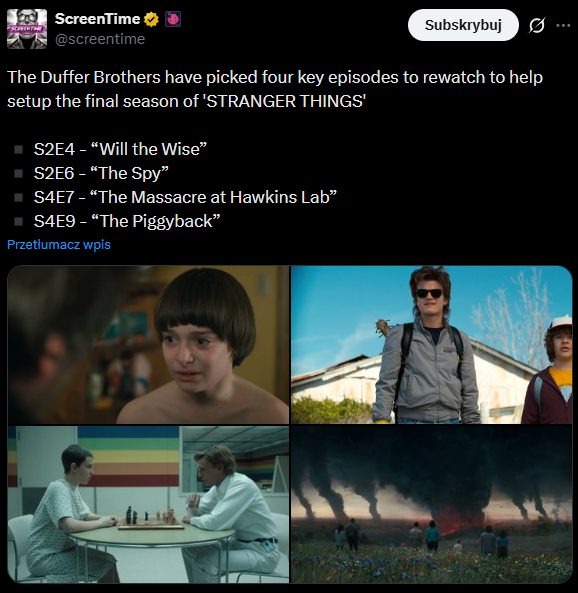 Bracia Duffer wybrali cztery kluczowe odcinki do ponownego obejrzenia, aby przygotować się na finałowy sezon serialu STRANGER THINGS i sam dziś się za nie zabieram, bo premiera pierwszych 4 odcinków już o 2:00 w nocy!