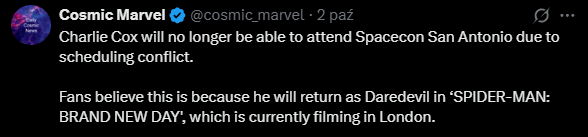 Długa broda Charliego Coxa, ostatnia duża plotka o pojawieniu się Daredevila w SPIDER-MAN: BRAND NEW DAY i co ważne, odwołanie występu aktora na Comicon w San Antonio ze względu na konflikty w grafiku.
