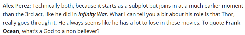 Thor będzie miał wątek poboczny, ale stanie się on częścią głównej historii na długo przed trzecim aktem, podobnie jak miało to miejsce w Infinity War. Będzie miał wiele do stracenia w tym filmie i będzie musiał zmierzyć się z wieloma trudnościami.