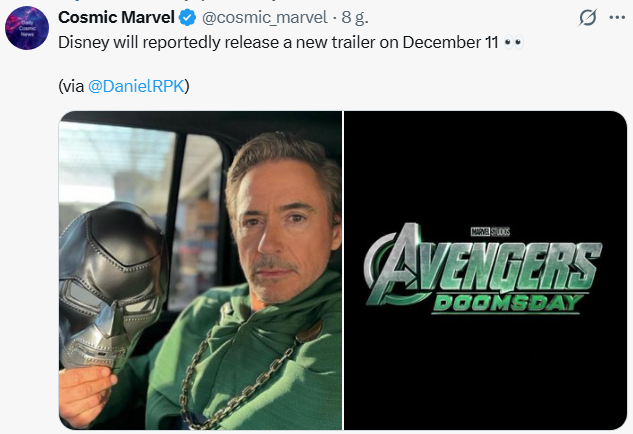 Tak, to plotka, jednak według informacji od DanielRPK, być może już 11 grudnia zobaczymy PIERWSZY zwiastun niesamowicie wyczekiwanego filmu AVENGERS: DOOMSDAY!