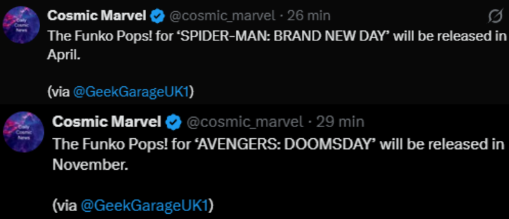 Wedle najnowszych informacji oficjalne figurki z filmu SPIDER-MAN: BRAND NEW DAY trafią do sprzedaży już w kwietniu. W kwestii AVENGERS: DOOMSDAY na oficjalne figurki poczekamy do Listopada 2026! Figurki te zostały już zaprezentowane prywatnie na londyńskich targach zabawek.