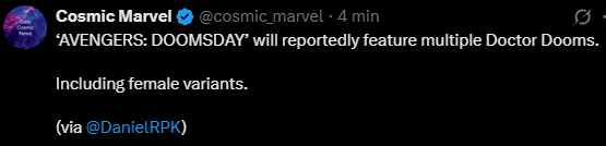 Według doniesień w filmie „AVENGERS: DOOMSDAY” pojawi się wielu Doktorów Doomów, także w wersji żeńskiej.