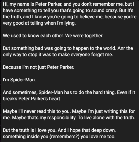 Jest to piękny list Petera do MJ i osobiście liczę, że w pewnym momencie filmu czy to przypadkiem czy nie, MJ otrzyma lub nawet znajdzie tę kartkę i przeczyta to, o czym pisał nasz Spider-Man.